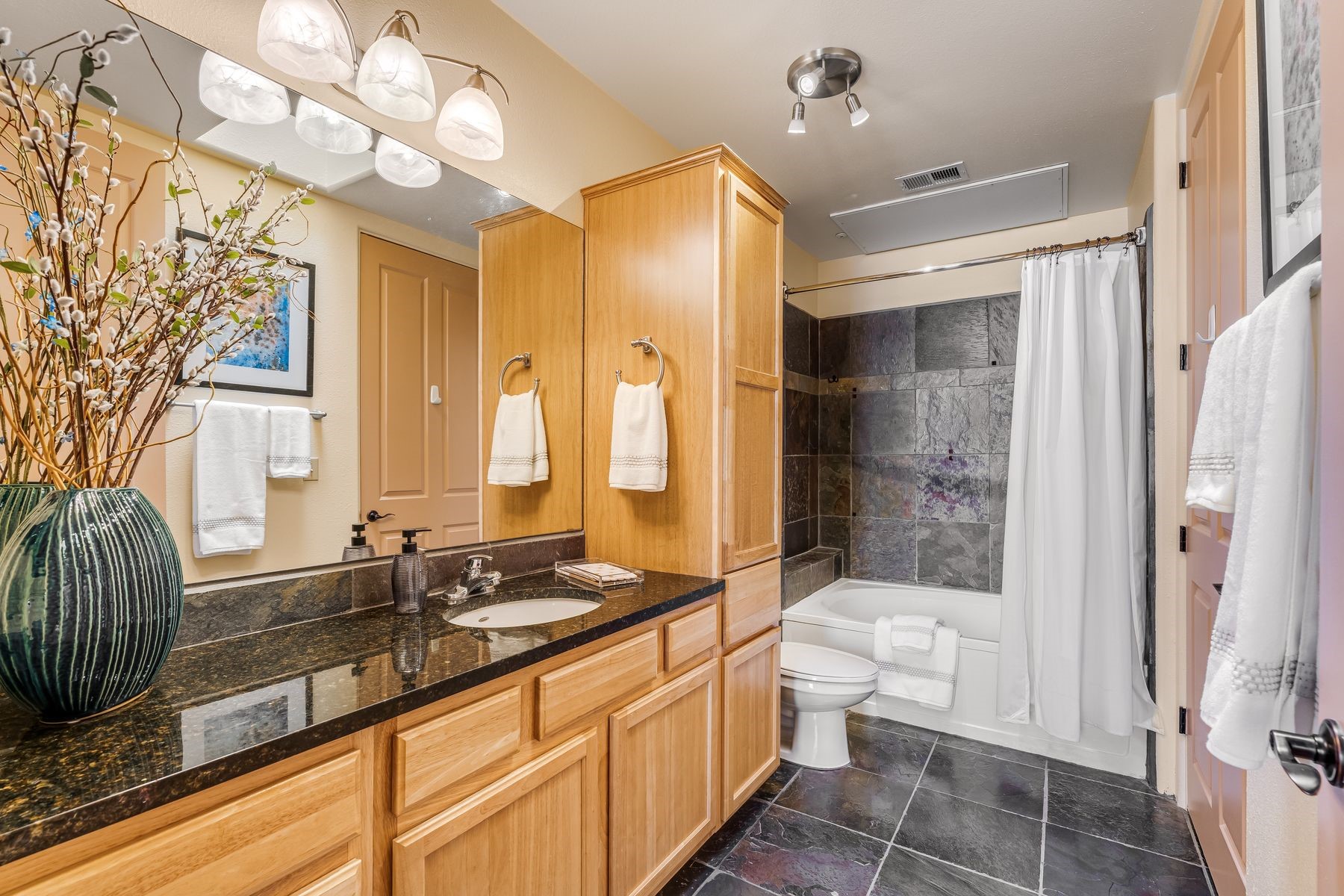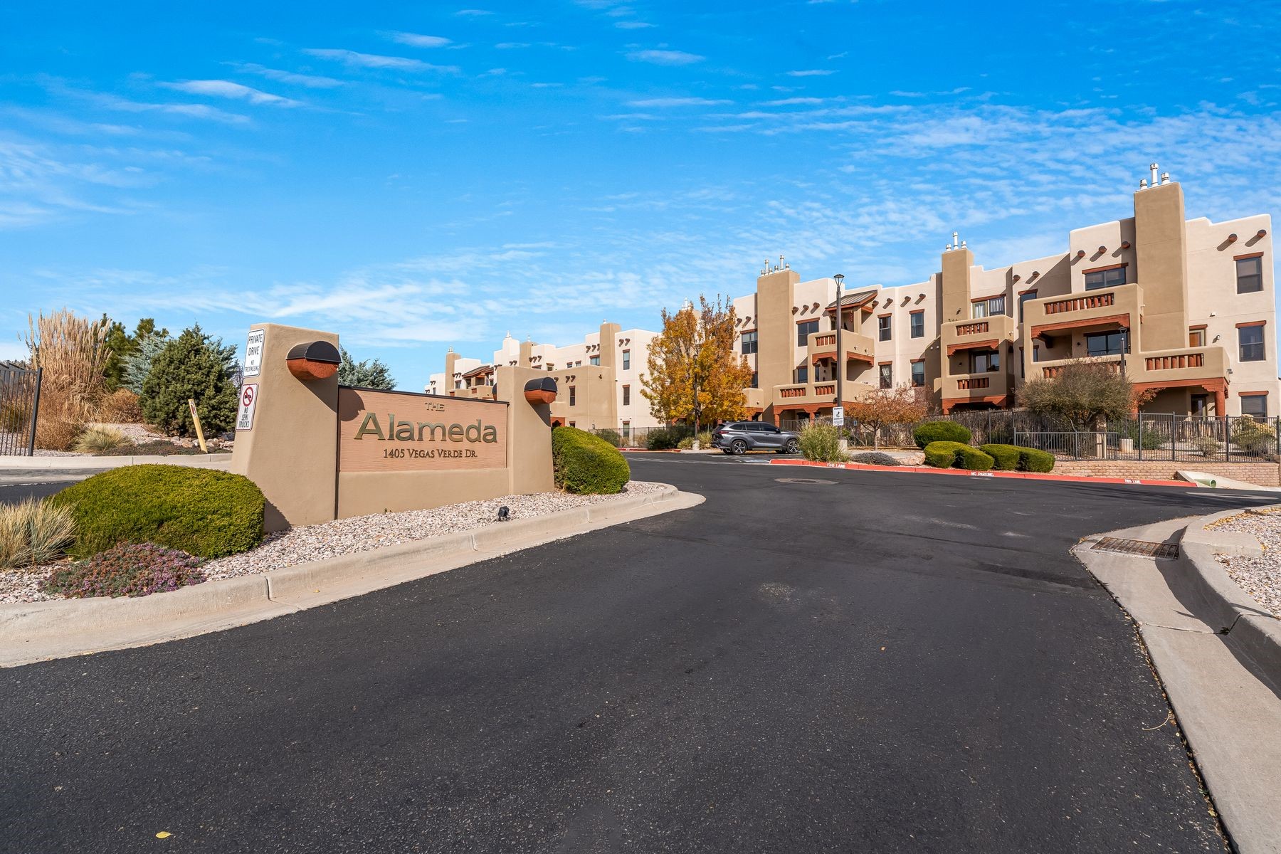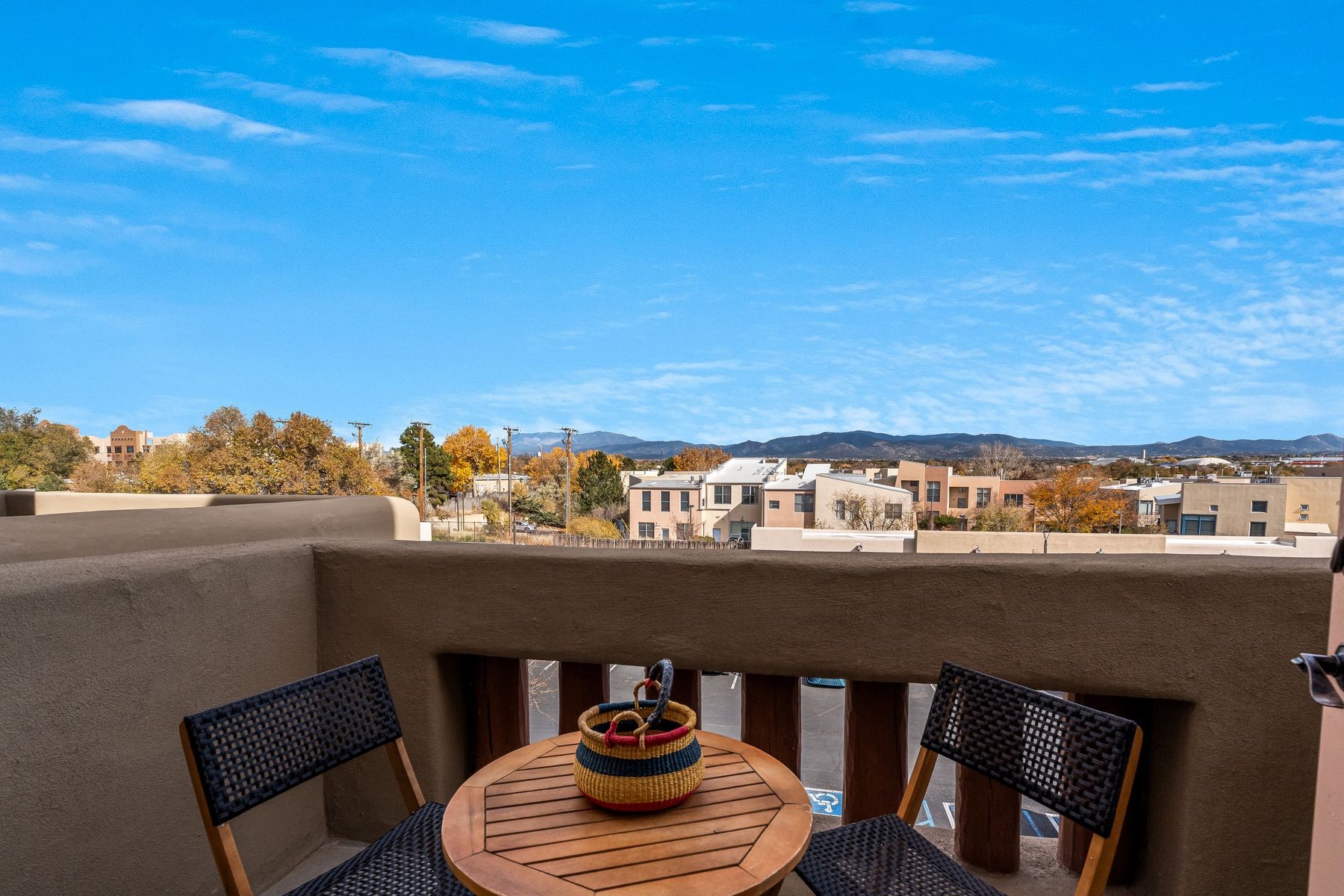 High-end top floor elegance at The Alameda! This 1 Bedroom/1 Bathroom luxe condo has rare and sought after Sangre de Cristo mountain views from the Living Room, Kitchen, Bedroom and Balcony. Enjoy the fine architectural interior features of wood vigas, tongue and groove ceilings, corbels and a handsome corner gas kiva fireplace. Significant upgrades have been made this year that include: All new paint, stripped and sealed slate flooring, 100% berber carpeting, new induction stove, Elfa custom closets, new hot water tank, new pendant lighting and new blinds. This unit includes a one-car garage and 50 square foot storage room right across the hallway. The Alameda is a luxury amenity condominium gated community that includes: Heated outside swimming pool with BBQ; Fitness Center; Party Rooms with Kitchens and Lounge Areas throughout and a Dog Run. Onsite professional manager and 24 hour controlled access. Fabulous location and close to shopping, dining and entertainment. This great opportunity can be yours so live La Dolce Vita and schedule your showing today!