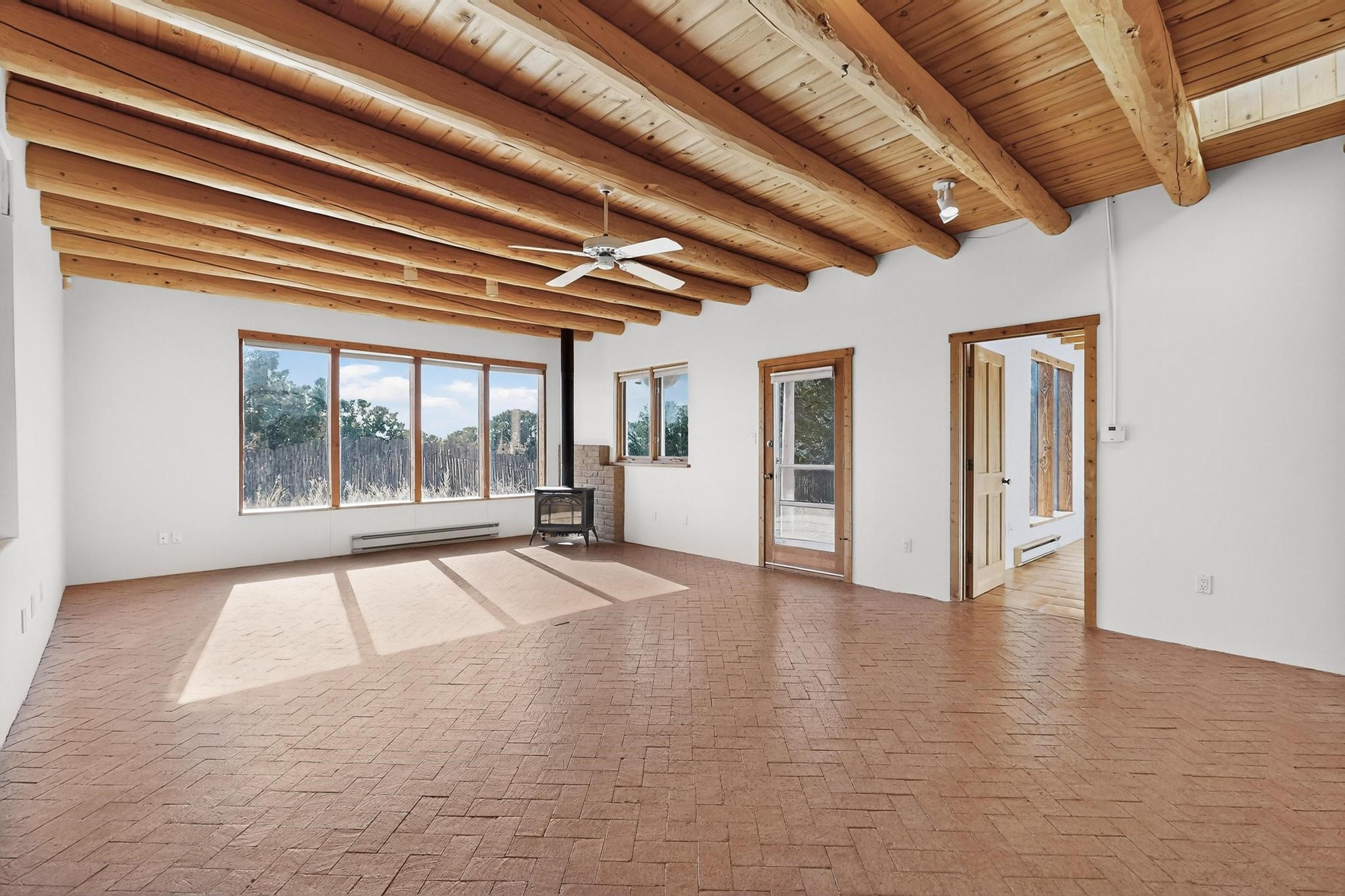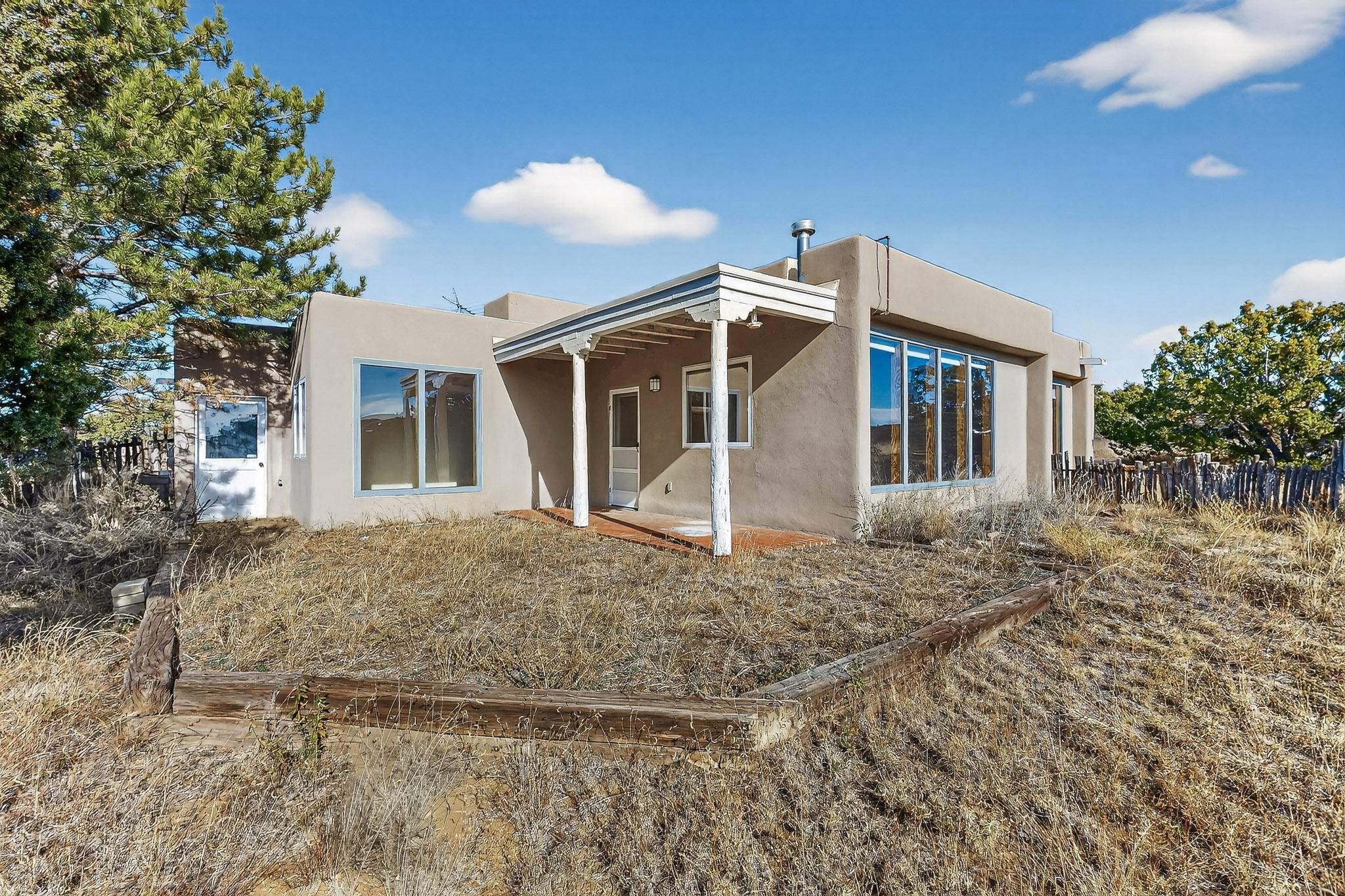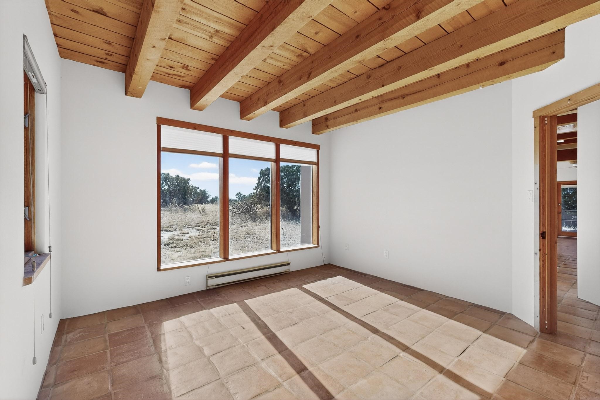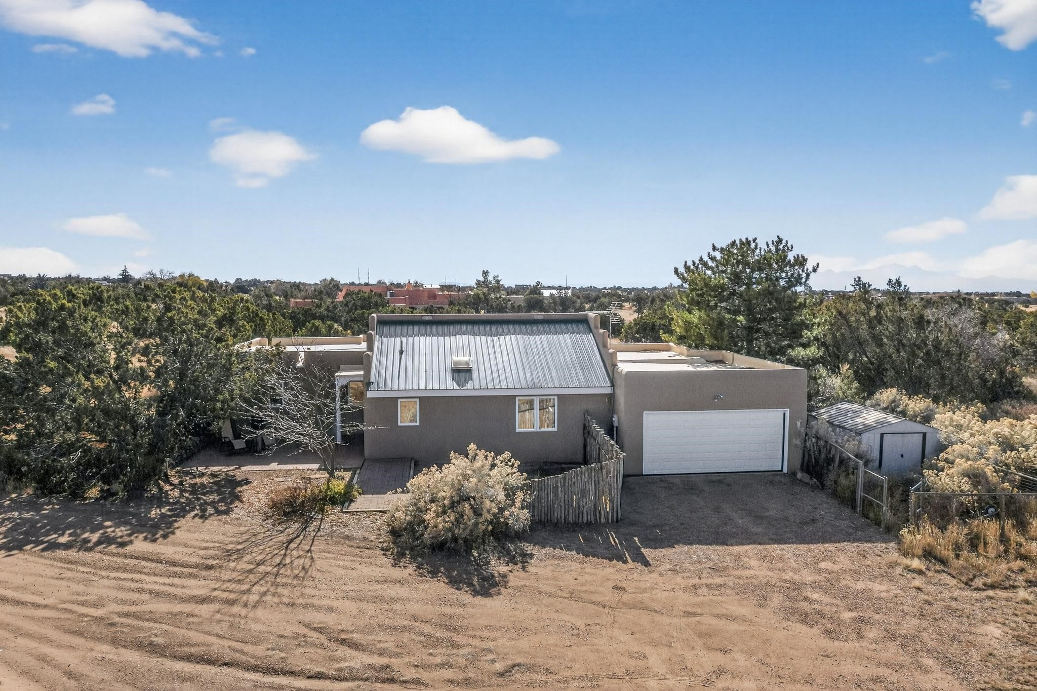 Located on an expansive Eldorado open space this is ideal for the night sky and naturalist enthusiast. Lovely traditional open plan, 1840sf passive solar design built by James Garton in 1990. The sunny split bedroom floorpan provides excellent separation for the main bedroom from the two guest bedrooms plus there is also a separate studio/den. Gleaming Santa Fe style saltillo tile and brick floors and beam ceilings throughout most rooms. Long south facing windows replaced in 2020, bring in the winter heat with overhangs adding shade in the summer.. A new TPO roof was installed in 2022. All appliances have been replaced in the last 5 years, and the hot water heater was replaced in 2020. There is a whole house filtering system, and a private front view brick patio added in 2021. here is an oversized 2 car garage plus plenty of guest parking. This home is accessed by paved roads and is within easy reach of Eldorado amenities, local shopping, schools, library and the senior center, only minutes into Santa Fe.