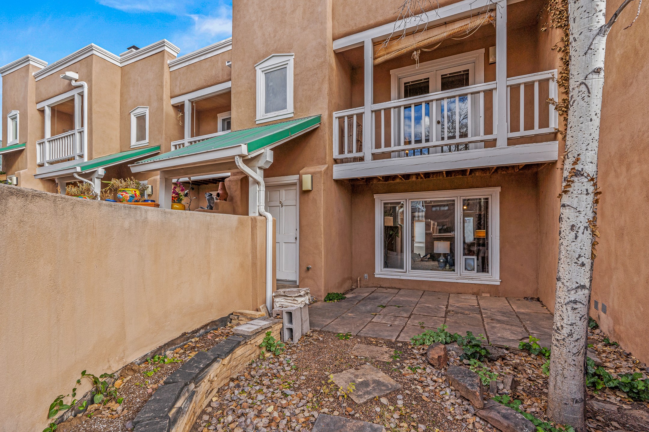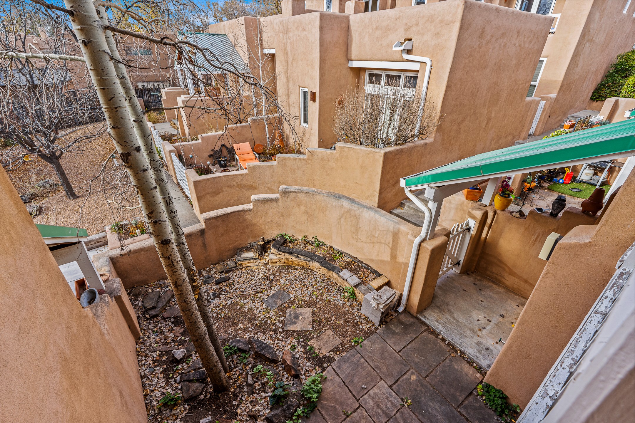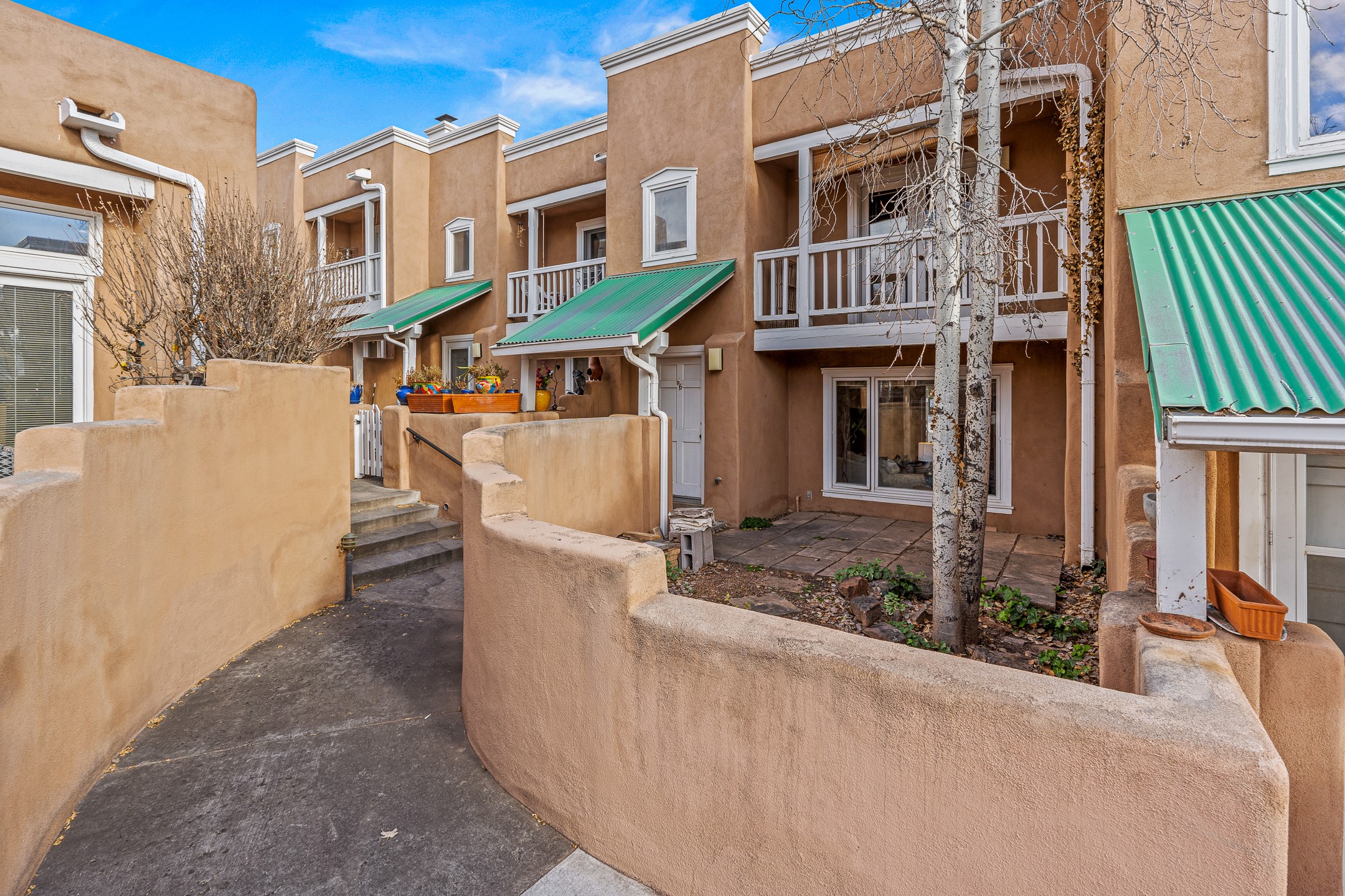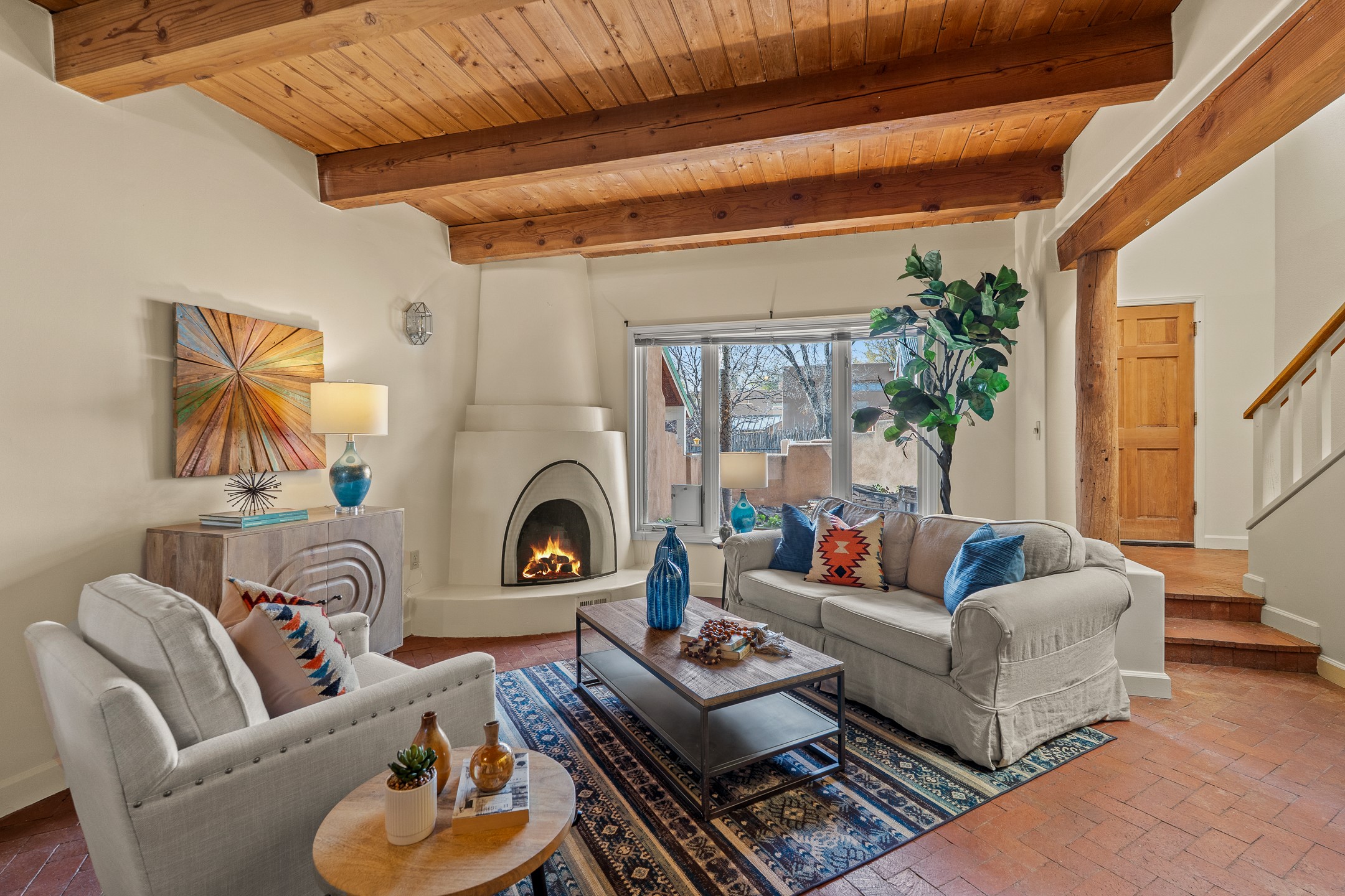 Just steps from the historic Plaza, this charming 2-bedroom, 2-bath condo embodies the true spirit of Santa Fe living. Classic brick floors, vigas and high beamed ceilings, and a traditional wood-burning kiva fireplace create an authentic Southwestern ambiance from the moment you enter. The main living and dining areas feel warm and inviting, complemented by a cozy bar nook and a convenient three-quarter bath on the first level.The kitchen offers generous counter space, a large window over the sink that frames the changing New Mexico light, and a traditional pass-through to the dining area--perfect for casual gatherings. An elegant oak stairway, crowned by a soaring skylight, leads to the upper-level bedrooms. Sunlight fills the space, enhancing the natural textures and warm tones throughout.Both bedrooms feature ample closets and share a full bath, while expansive windows and the upper skylight welcome bright desert light and capture distant mountain views. With no carpeting, the home maintains its clean, easy-care, Southwestern aesthetic.A rare detached one-car garage provides valuable storage and convenience in this prized downtown location. With its blend of regional character, natural materials, and unbeatable proximity to Santa Fe's galleries, restaurants, and historic streets, this property offers the quintessential Southwestern retreat.