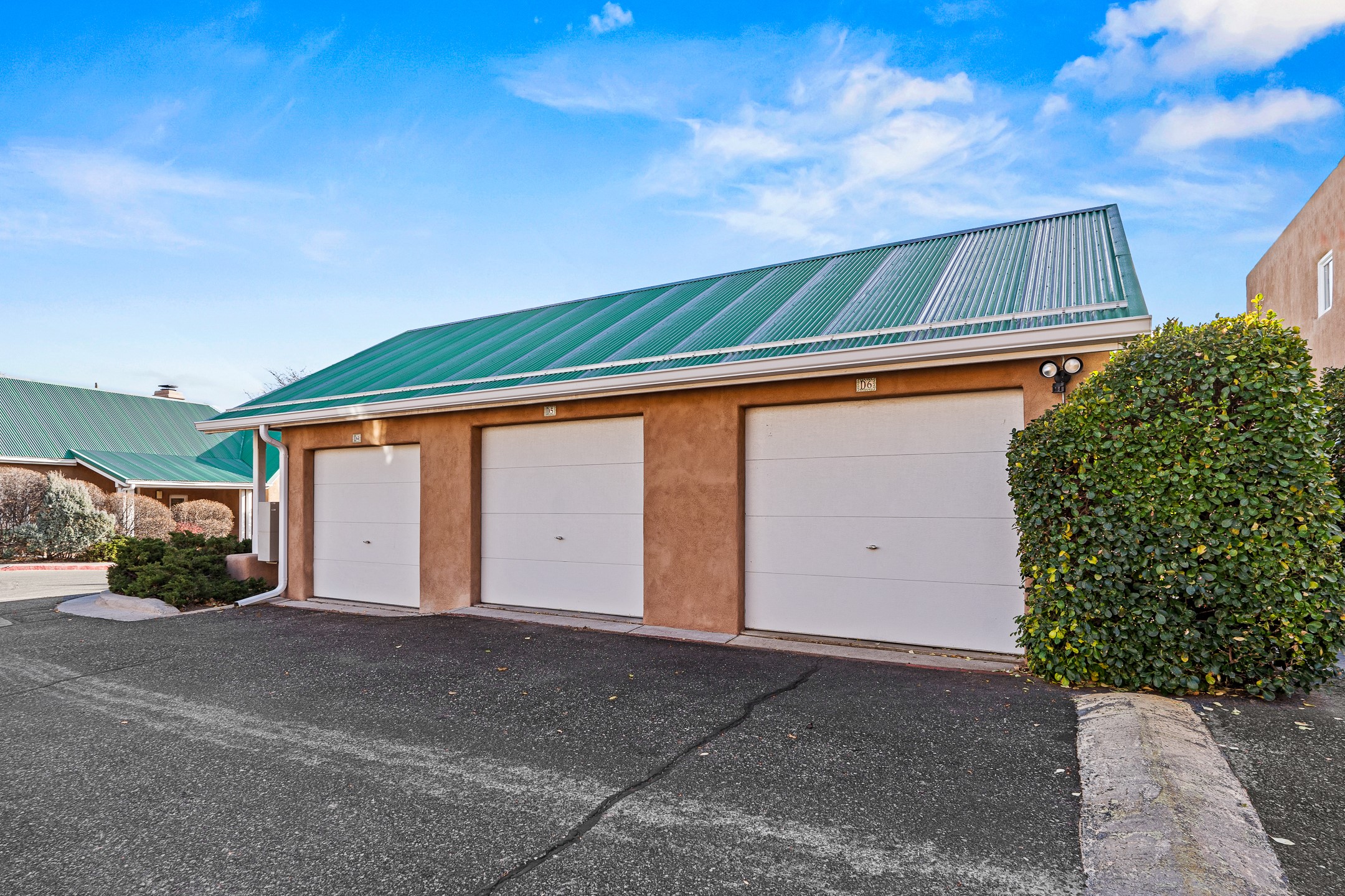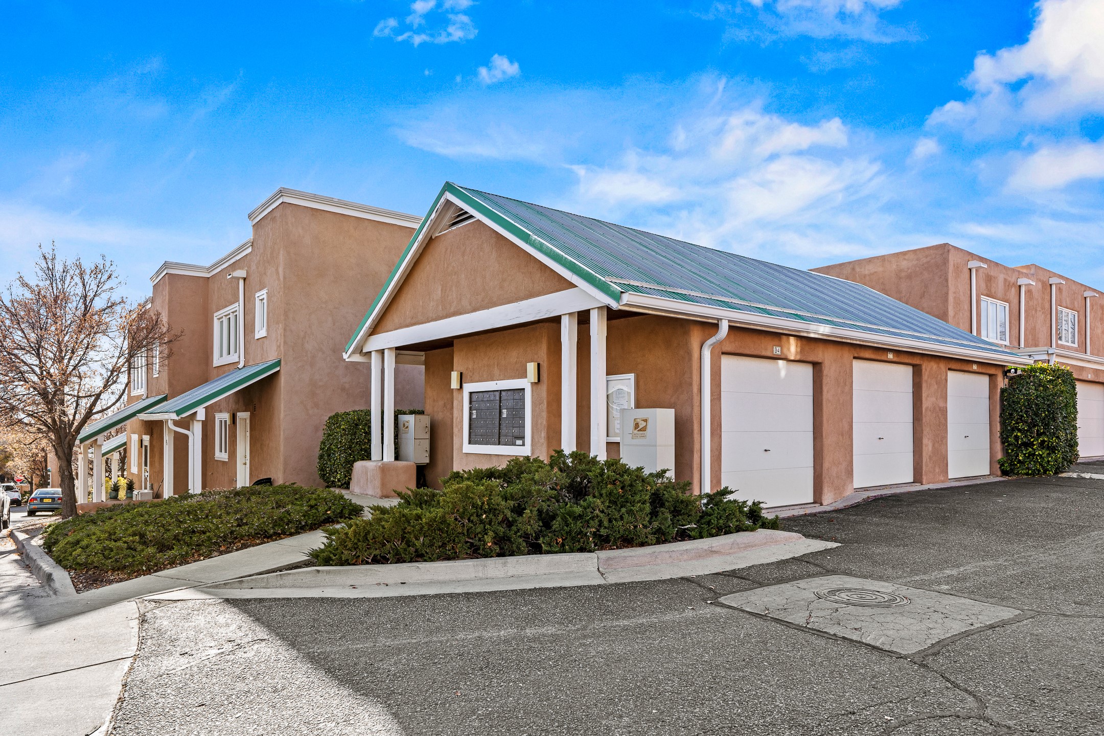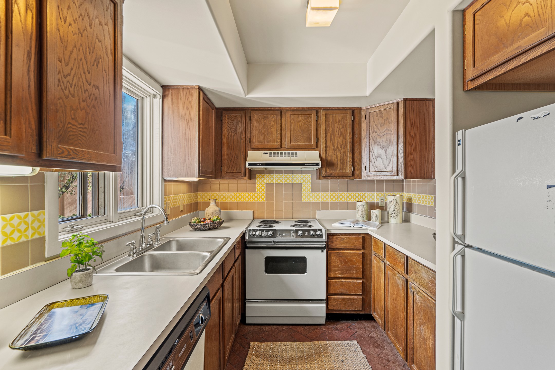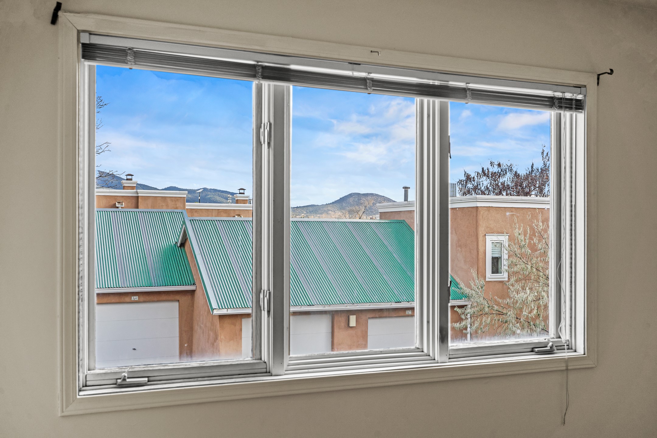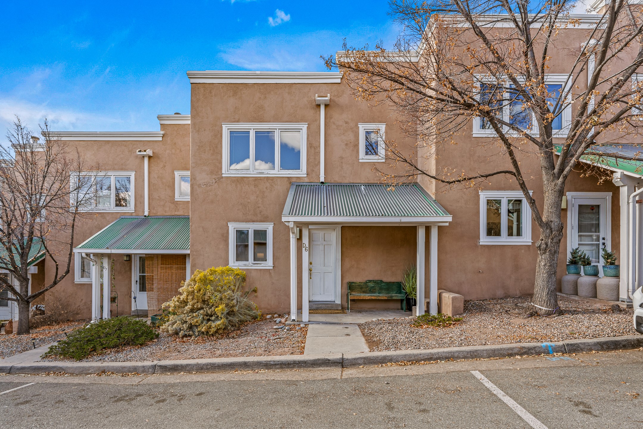 Just steps from the historic Plaza, this charming 2-bedroom, 2-bath condo embodies the true spirit of Santa Fe living. Classic brick floors, vigas and high beamed ceilings, and a traditional wood-burning kiva fireplace create an authentic Southwestern ambiance from the moment you enter. The main living and dining areas feel warm and inviting, complemented by a cozy bar nook and a convenient three-quarter bath on the first level.The kitchen offers generous counter space, a large window over the sink that frames the changing New Mexico light, and a traditional pass-through to the dining area--perfect for casual gatherings. An elegant oak stairway, crowned by a soaring skylight, leads to the upper-level bedrooms. Sunlight fills the space, enhancing the natural textures and warm tones throughout.Both bedrooms feature ample closets and share a full bath, while expansive windows and the upper skylight welcome bright desert light and capture distant mountain views. With no carpeting, the home maintains its clean, easy-care, Southwestern aesthetic.A rare detached one-car garage provides valuable storage and convenience in this prized downtown location. With its blend of regional character, natural materials, and unbeatable proximity to Santa Fe's galleries, restaurants, and historic streets, this property offers the quintessential Southwestern retreat.