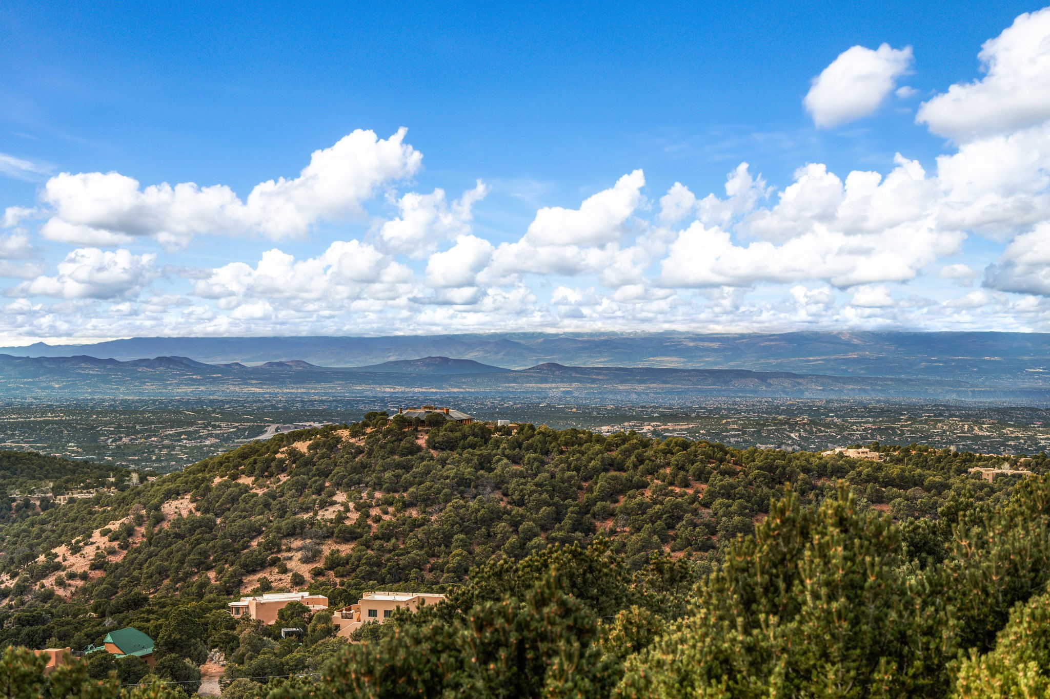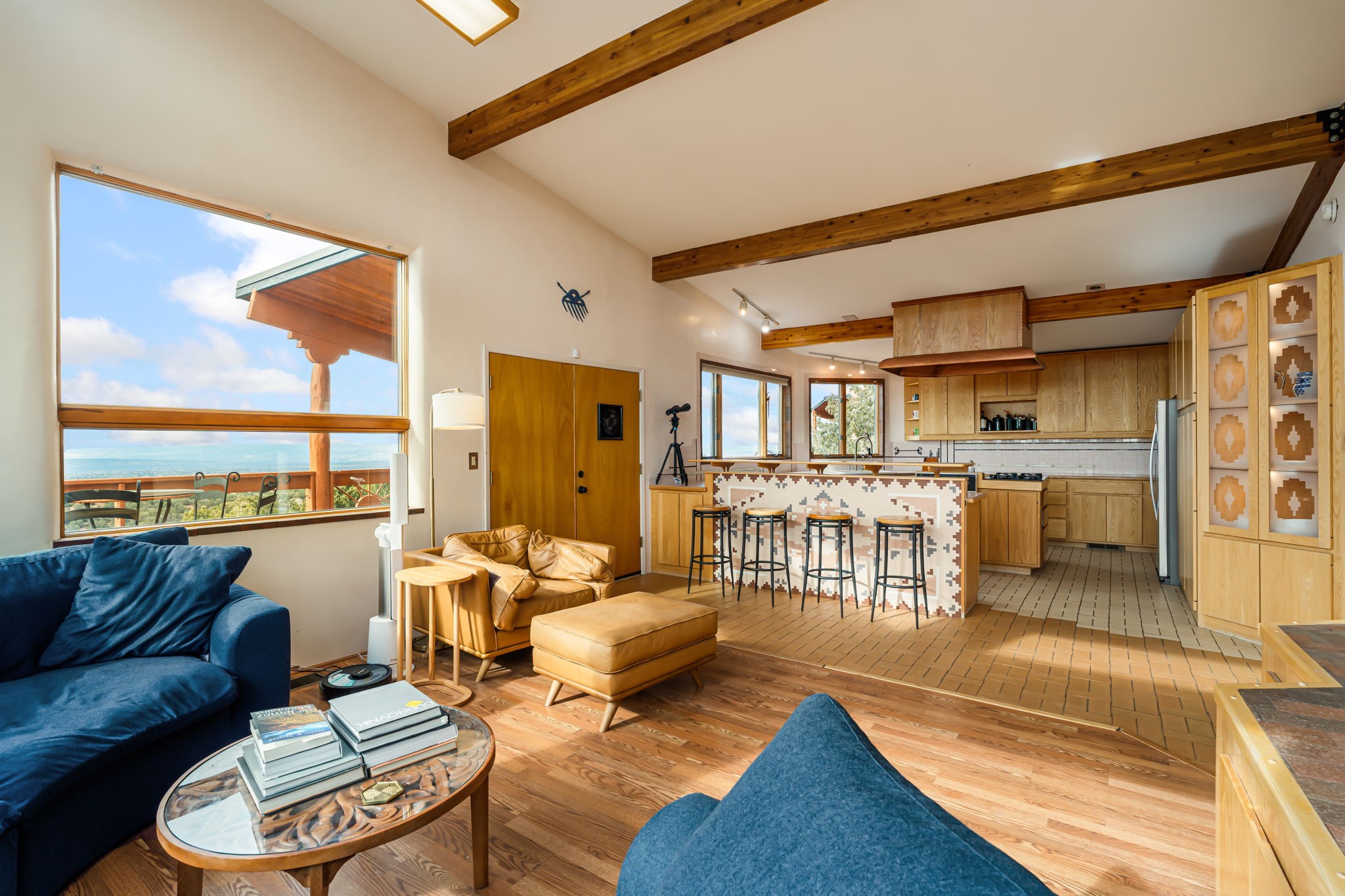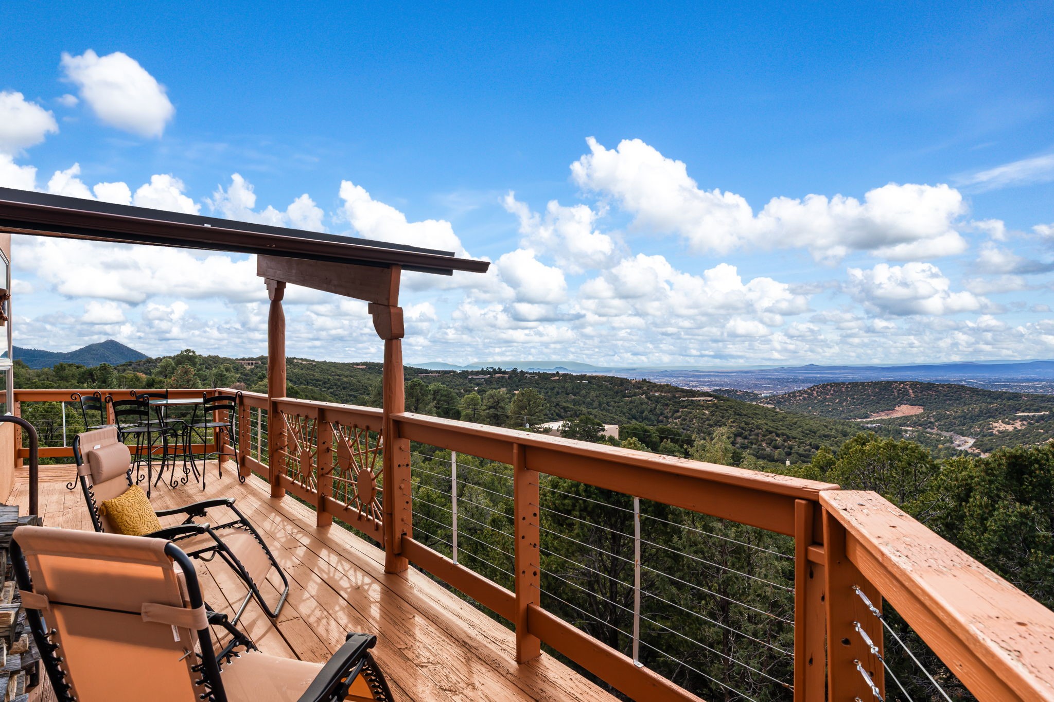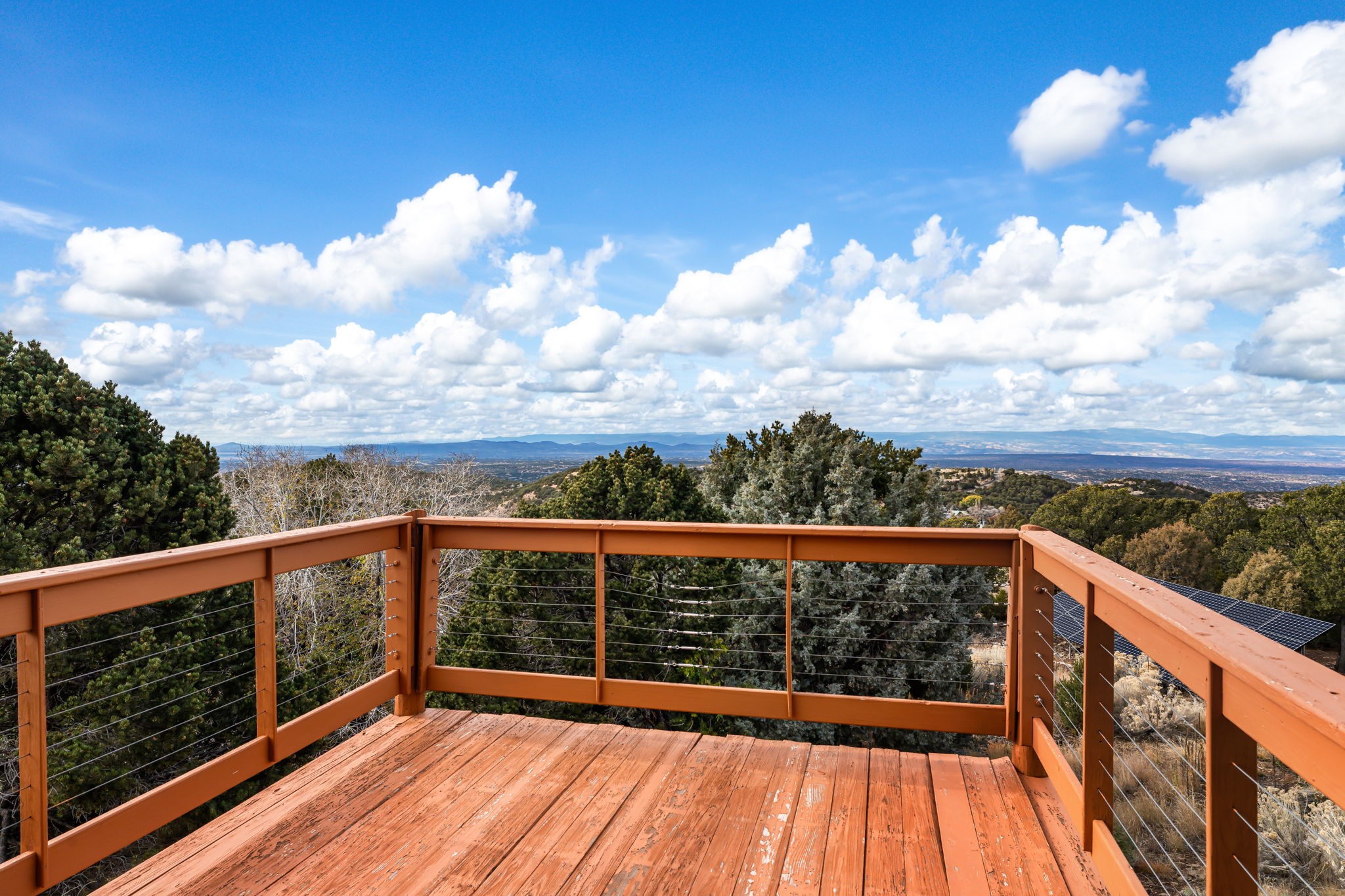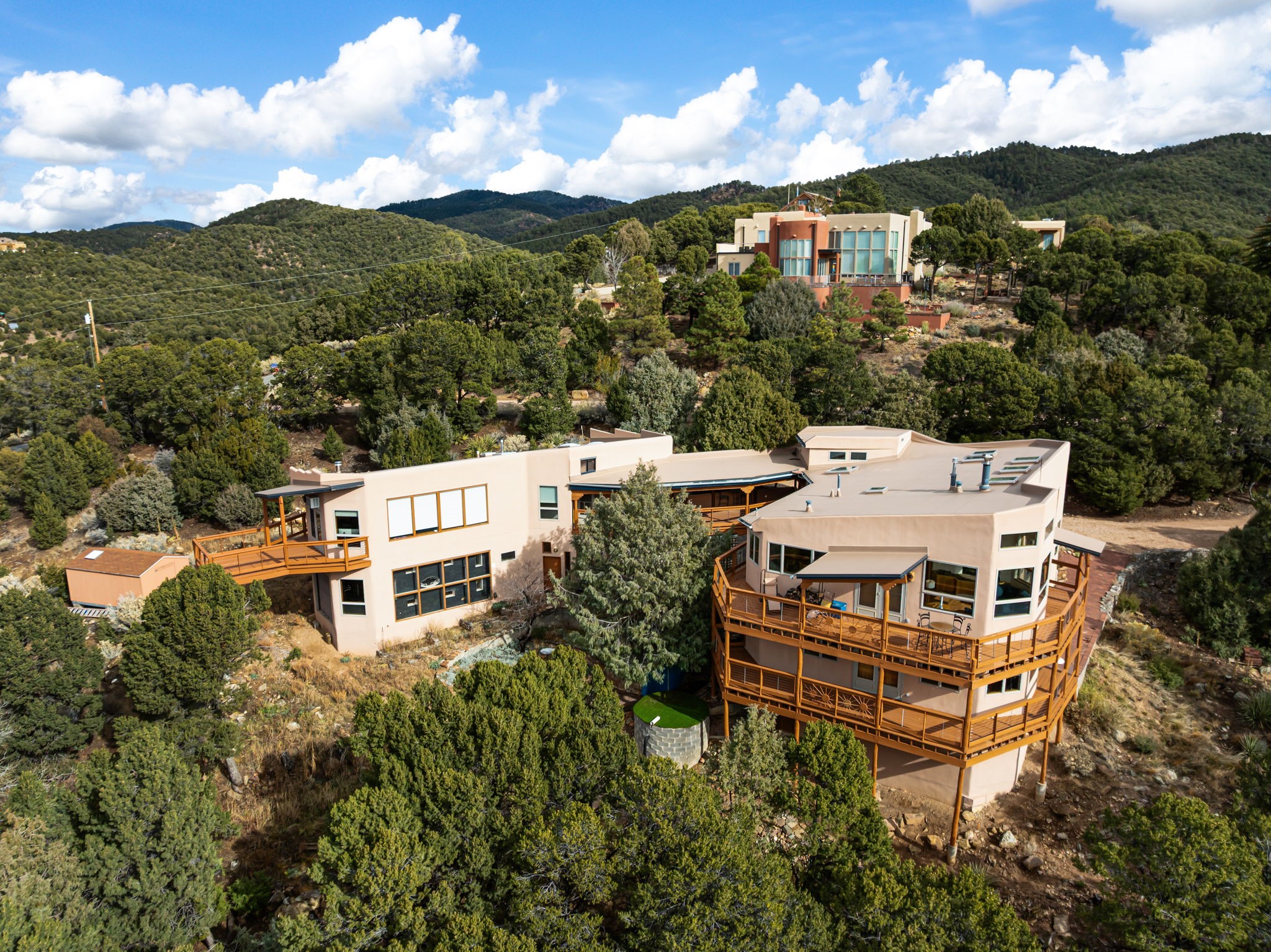 Imagine a stunning retreat atop the world, where the enchanting views of Santa Fe and the renowned New Mexico skies stretch out before you. Elevated at 8,000 feet, this home offers unforgettable western views with sunsets that paint the sky with vibrant colors. Inside, you'll find a blend of artistry and craftsmanship with diamond plaster walls, wooden beams, etched glass and cozy cork ceilings, all framed by a newer roof and stylish stucco that add to its charm. Every corner of this home exudes creativity from the original owners, from the beautifully situated kitchen and living room that bathe in westward light to an inviting pottery/art studio that doubles as a sun room or plant sanctuary. The thoughtful design embraces passive solar elements and solar panels, making it energy efficient. The versatile and separate studio is not just an area to create--it's a dream come true for writers, artists, designers or jewelry makers looking to bring their creativity to life. And with abundant storage throughout, you'll have room for all your inspirations. Located just moments away from the serene Santa Fe National Forest, thrilling slopes at the Santa Fe Ski Basin, and the scenic hiking/biking trails of Dale Ball, this home isn't just a place to live; it's a canvas for your life's next masterpiece.