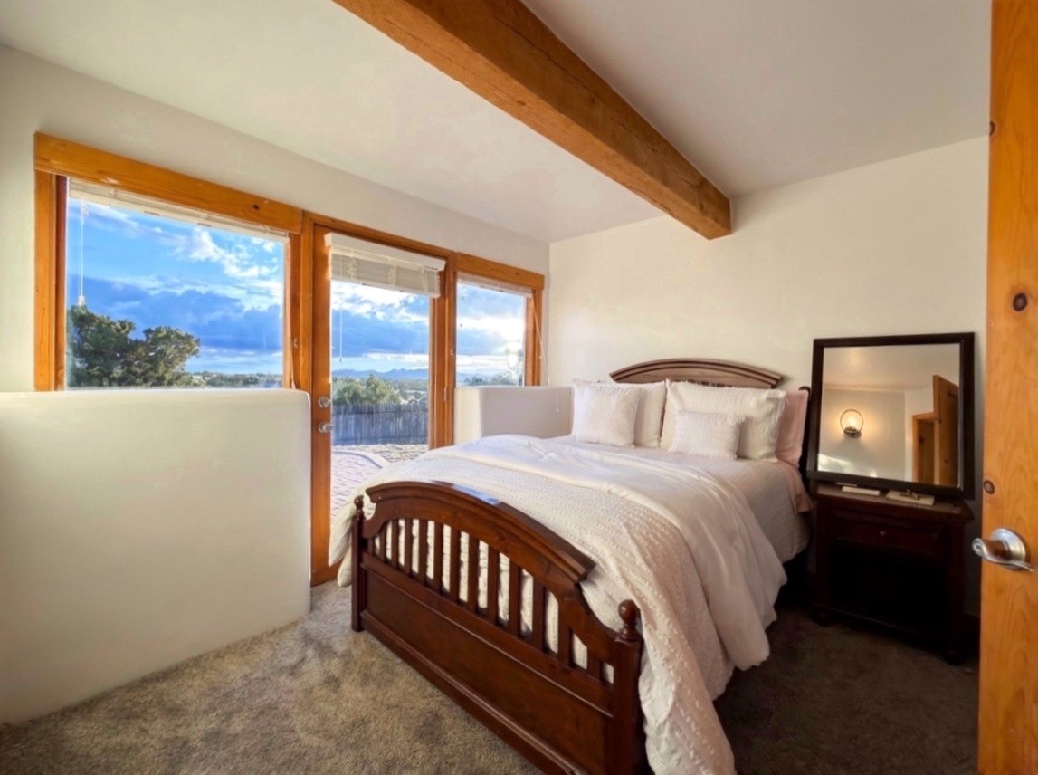 Privately located on a quiet cul-de-sac down a paved driveway, this wonderful passive-solar two-story home offers three bedrooms, 2 baths, and abundant natural light. The upper level features a spacious open living area with wood ceiling beams, a new corner kiva fireplace, clean modern lines, and a beautifully updated design. The separate dining area and an breakfast nook create flexible living spaces. Sliding doors lead to a stunning Trex-style deck with a built-in banco--perfect for enjoying the spectacular Jemez and Ortiz mountain views and western sunsets.The bedrooms are located downstairs, each with its own outdoor entrance and access to the covered patio and fully enclosed yard. The 2.24-acre lot provides generous outdoor space, including a new portal with latilla fencing surrounding the backyard.Additional features include mini-splits for efficient heating and cooling, an alarm system, and an attached 2-car garage. Hiking trails and the Rail Trail are just outside the backyard, and the home is conveniently located near all Eldorado amenities and the Eldorado Community School. Come take a look!