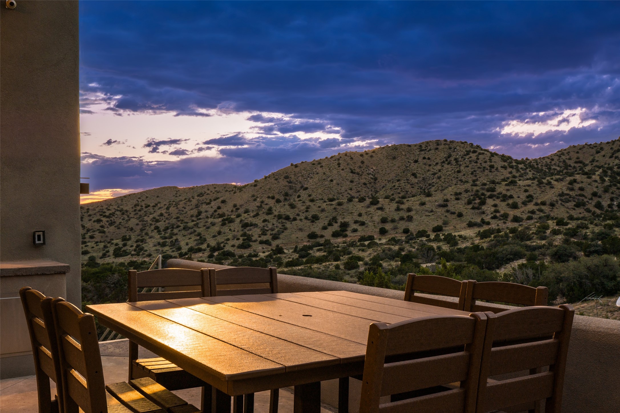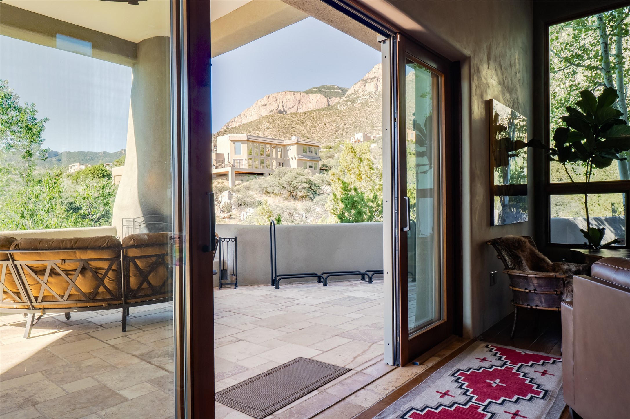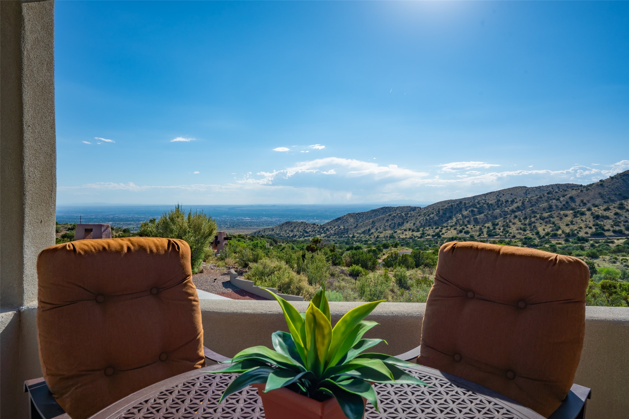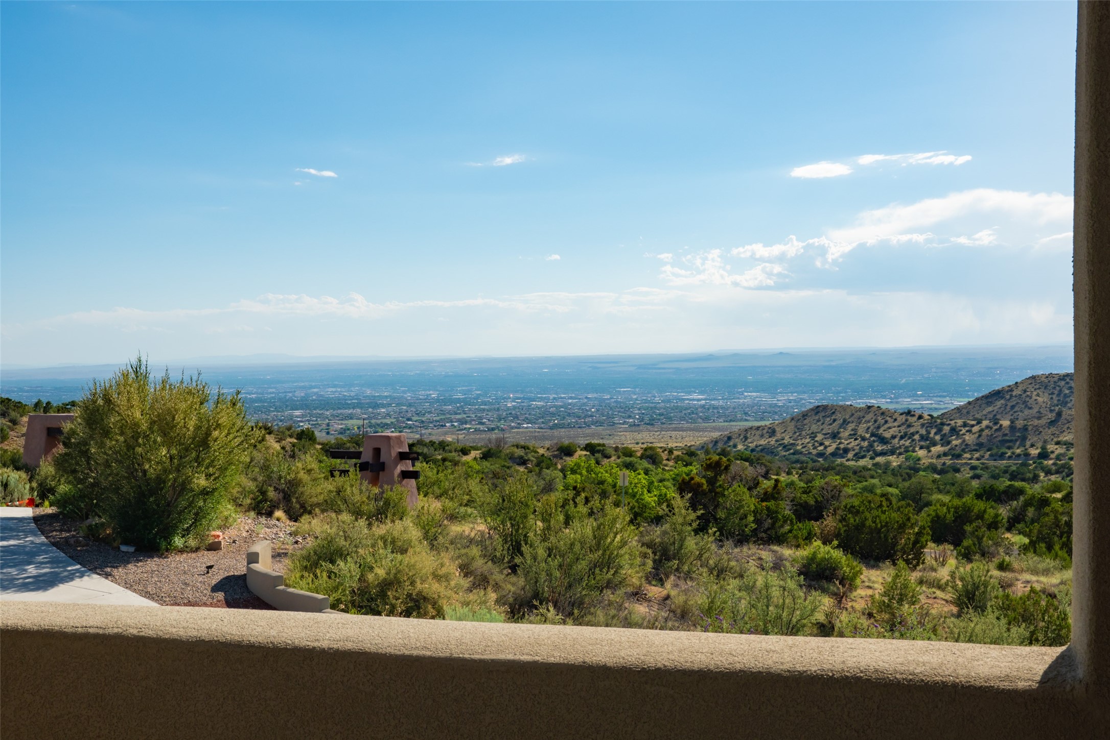 Fronting to National Forest land with forever views of the sunsets, twinkling city light like a jewel box below and endless mesa tops beyond, the special retreat awaits. Custom built with special, quality materials, this home is special. Enter to a view of Sandia Peak and a private Zen garden. To your right, you will find a tremendous guest suite with a large sitting room or fun flex space with windows to enjoy the city lights, a bedroom with private bath with a no step walk-in shower and patio access. To your left from the entry, follow the travertine floors to a spacious kitchen with huge island, gas cooktop, double ovens, warming drawer, walk-in pantry w/dumb waiter to garage level, and generous dining area overlooking the mountains. In the southwest, our weather is so beautiful that the patios become some of our favorite rooms of the house! From the great room, access two patios, one with a fireplace and mounain views and one protected, private patio with garden view. This room includes a wood burning fireplace, scraped wood floors, soaring ceiling and plaster walls. In private wings you will find a luxurious primary suite with gas fireplace, sitting room or workout space, HUGE closet, patio access, and spa like bath with soaking tub, multi head shower, separate steam shower and access to outdoor hot tub to enjoy the starry night skies. In the opposite wing, find bedroom, bath, and second living area with endless vistas. Each bedroom wing includes a sitting rm beside which is great for multi-generational living. Oversized 3 car garage with storage. Owned solar panels. Geothermal heating and cooling. 1.19 acre lot with community water. Truly remarkable home.
