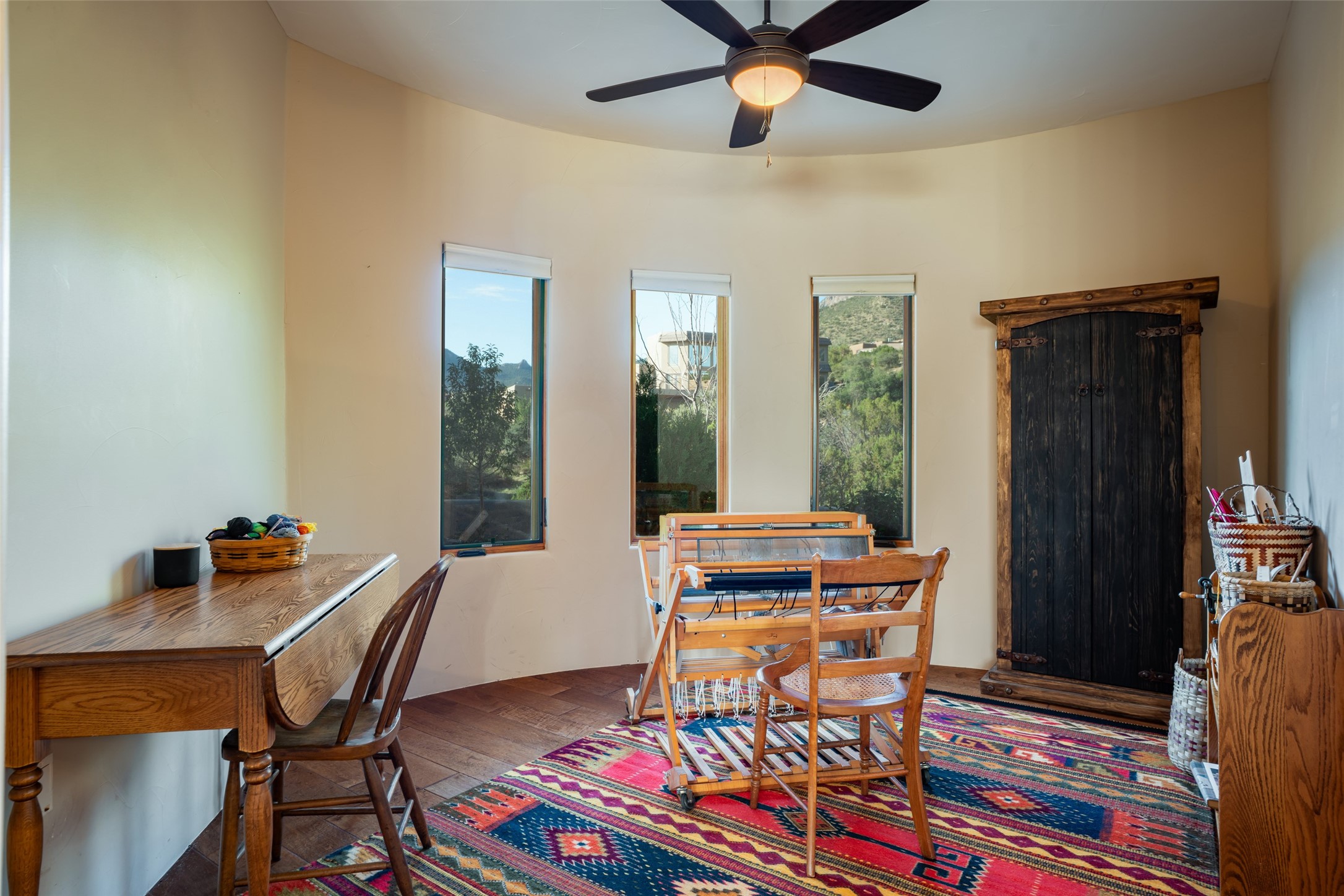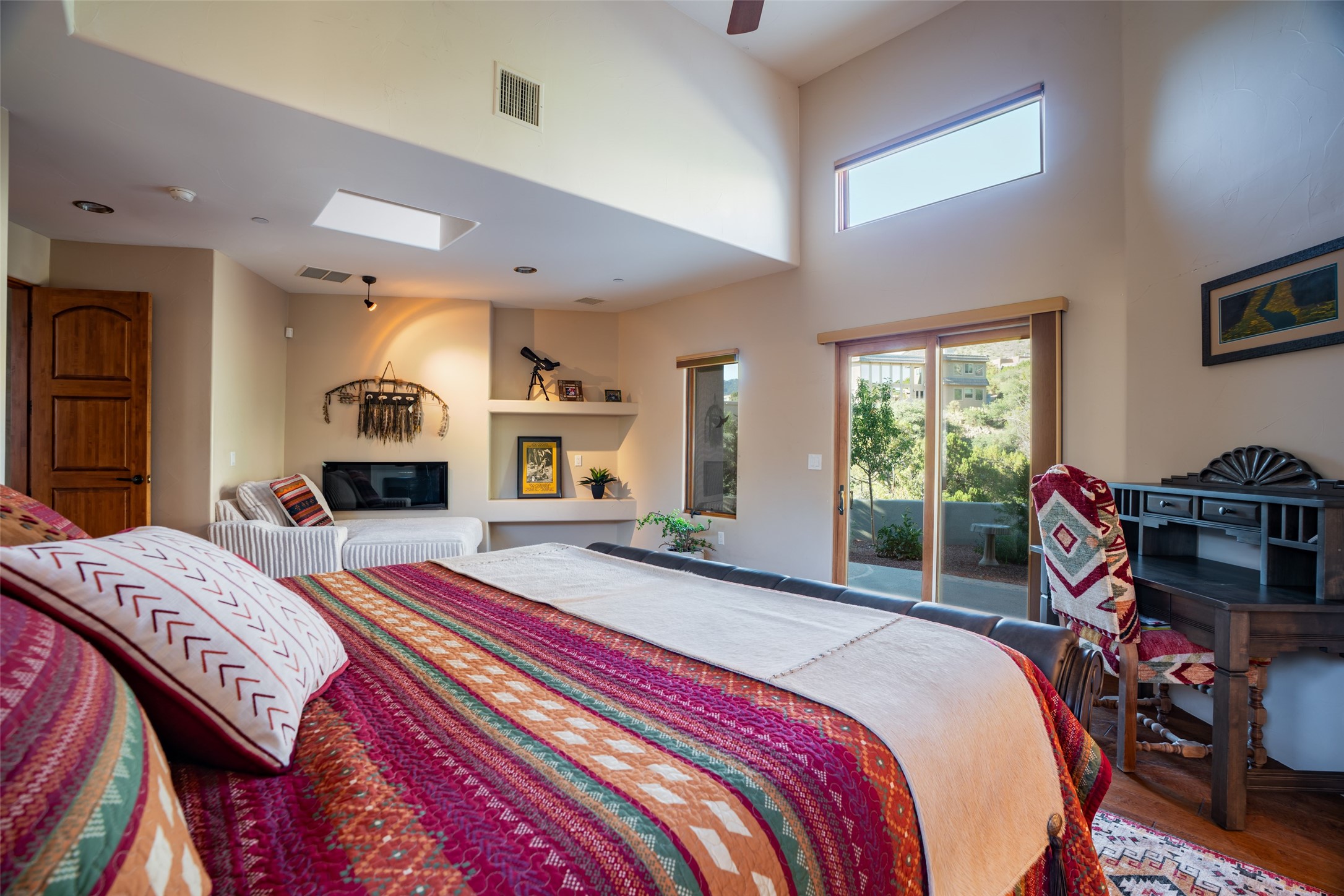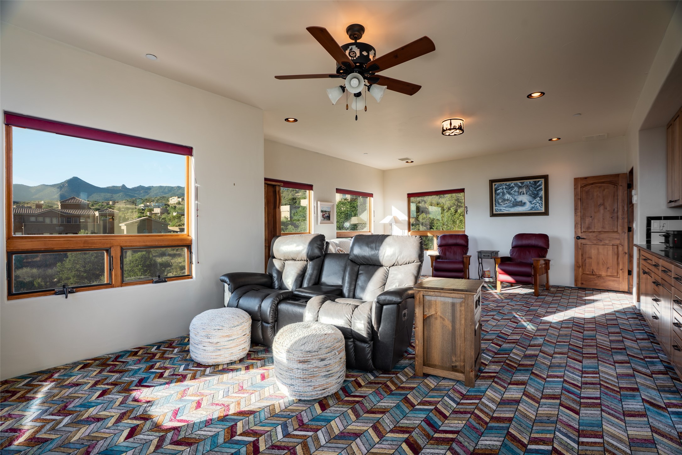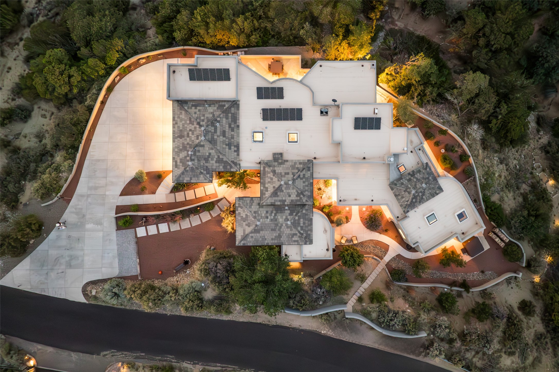 Fronting to National Forest land with forever views of the sunsets, twinkling city light like a jewel box below and endless mesa tops beyond, the special retreat awaits. Custom built with special, quality materials, this home is special. Enter to a view of Sandia Peak and a private Zen garden. To your right, you will find a tremendous guest suite with a large sitting room or fun flex space with windows to enjoy the city lights, a bedroom with private bath with a no step walk-in shower and patio access. To your left from the entry, follow the travertine floors to a spacious kitchen with huge island, gas cooktop, double ovens, warming drawer, walk-in pantry w/dumb waiter to garage level, and generous dining area overlooking the mountains. In the southwest, our weather is so beautiful that the patios become some of our favorite rooms of the house! From the great room, access two patios, one with a fireplace and mounain views and one protected, private patio with garden view. This room includes a wood burning fireplace, scraped wood floors, soaring ceiling and plaster walls. In private wings you will find a luxurious primary suite with gas fireplace, sitting room or workout space, HUGE closet, patio access, and spa like bath with soaking tub, multi head shower, separate steam shower and access to outdoor hot tub to enjoy the starry night skies. In the opposite wing, find bedroom, bath, and second living area with endless vistas. Each bedroom wing includes a sitting rm beside which is great for multi-generational living. Oversized 3 car garage with storage. Owned solar panels. Geothermal heating and cooling. 1.19 acre lot with community water. Truly remarkable home.